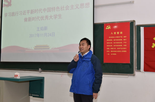 李素矿主持党课。他总结说,党课的精彩,引领人生的出彩。王焰新校长的党课与同学们分享了自己的学习体会、研读心得。党课内容引经据典,有理论有思想有实证,贯穿古今中外,是一堂生动、精彩、接地气的党课。体现了一校之长的政治家智慧与眼光、科学家的思维与严谨、教育家的希冀与鼓励,同时也是一名普通党员教师对同学们语重心长的谆谆教导。他强调,学习研读践行党的十九大精神,是环境师生当前和今后一个时期的重要政治任务。新时代在召唤青年,青年要不负新时代。同学们要真学真信真用,学懂弄通做实,要学出忠诚、学出自信、学出担当、学出责任,要学出创新创业的真本领。牢记学习使命,为实现中华民族伟大复兴的中国梦而努力学习,坚持用习近平新时代中国特色社会主义思想武装头脑,领航人生观、世界观、价值观,指导学习、工作和生活,做到价值取向与习近平同志为核心的党中央与祖国人民同心、学术方向与政治方向同向、学术卓越与思想卓越同行、学术魅力与人格魅力同在。