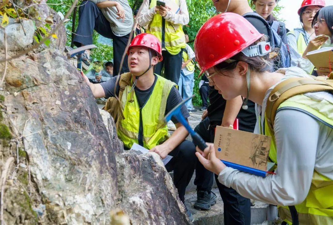 7月17日,中国地质大学(武汉)师生在秭归县链子崖观测岩石种类。