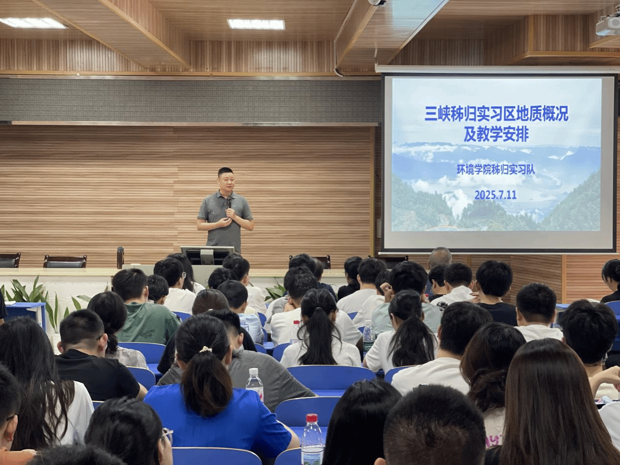 黄琨老师为同学们介绍三峡秭归实习区地质概况及教学安排,就实习区自然地理条件、区域地质概况和实习期间工作安排等方面作详细介绍。他强调,要严格遵守实习基地和学院实习实践各项管理规定,注重培养吃苦耐劳、团结协作的精神,在实习实践中不断总结反思,提高野外工作能力。同时,要牢固树立“安全第一”意识,加强风险防范,严格做好各项安全管理工作,确保实习实践安全。