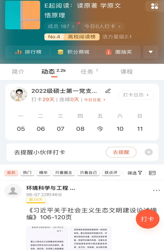(通讯员远沂霖 编辑耿婧)为深入学习宣传贯彻党的二十大精神,深入开展学习贯彻习近平新时代中国特色社会主义思想主题教育,把“学思想、强党性、重实践、建新功”的总要求贯穿主题教育全过程,坚持学思用贯通、知信行统一,努力在以学铸魂、以学增智、以学正风、以学促干方面取得实实在在的成效。“学习理论最有效的办法是读原著、学原文、悟原理”。2023年5月-6月,402永利集团官网入口学生党建中心举办“‘E’起阅读:读原著、学原文、悟原理”习近平生态文明思想读书打卡活动,扎实推动主题教育走深走实、取得实效。