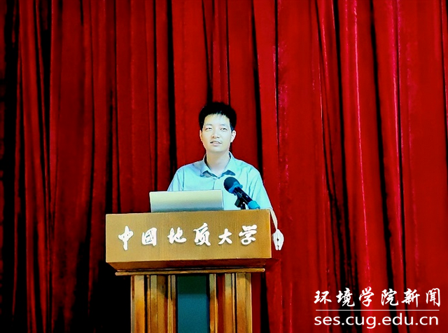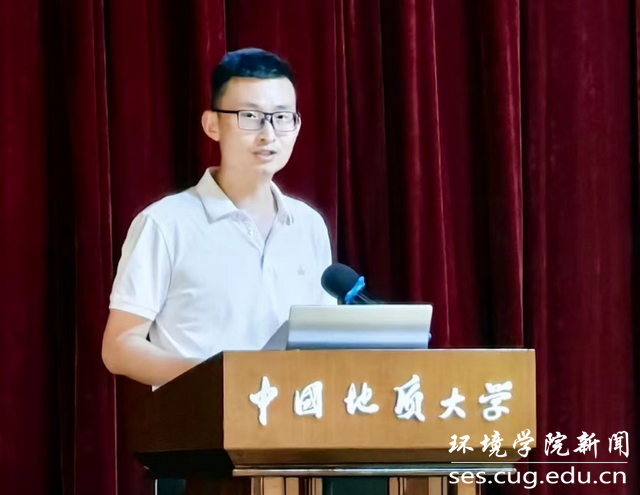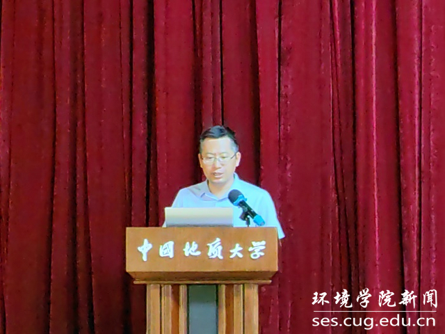 新生代表杨博超发言。他对这段时间为迎接和服务新生而辛勤付出的老师和学长学姐们表示衷心的感谢。他讲述自己对地大的向往和与环境保护事业的不解情缘,表示将勇担生态环保铁军的精神,为家乡的环境治理出一份力,在建设美丽中国的征程中奋斗不息。