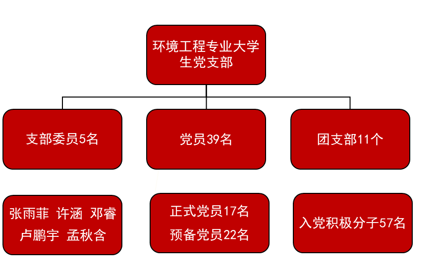 402永利集团官网入口环境工程专业大学生党支部共有党员39名,其中正式党员17名,预备党员22名,下属团支部现有入党积极分子57名。支部书记由张雨菲同志担任,其他支部委员分别为邓睿、许涵、卢鹏宇和孟秋含。