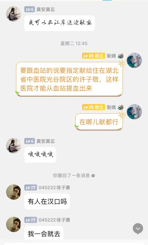 “老师,我可以!”、“老师,许同学的情况严重吗?我没有献过血,但是如果需要我愿意帮助”、“我在家附近的献血点可以献嘛?”一时间消息纷纷涌上,同学们急切的关心是莫大的温暖。很快,聚集了7、8名同学从南望山校区、未来城校区分别前往光谷地铁献血屋。