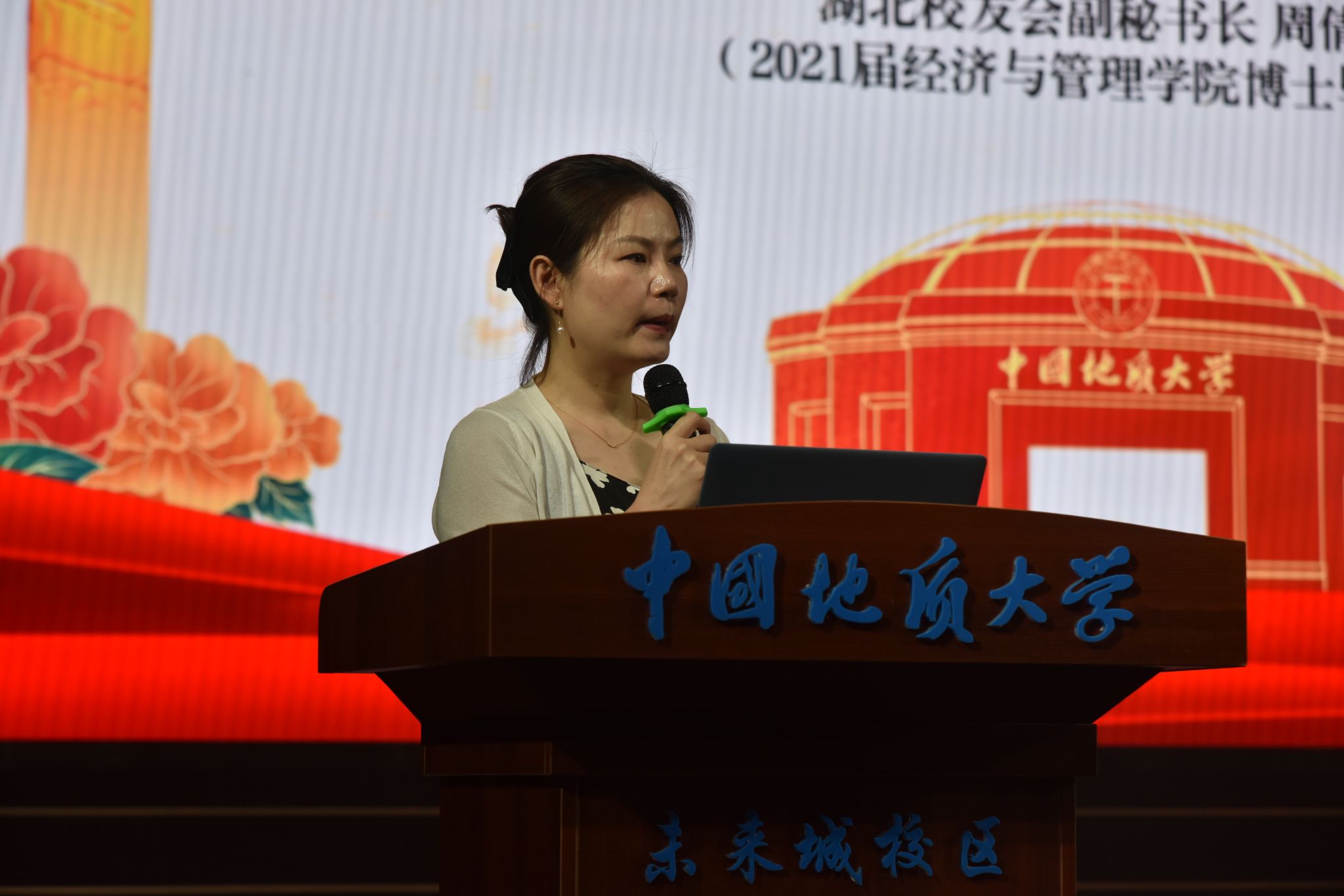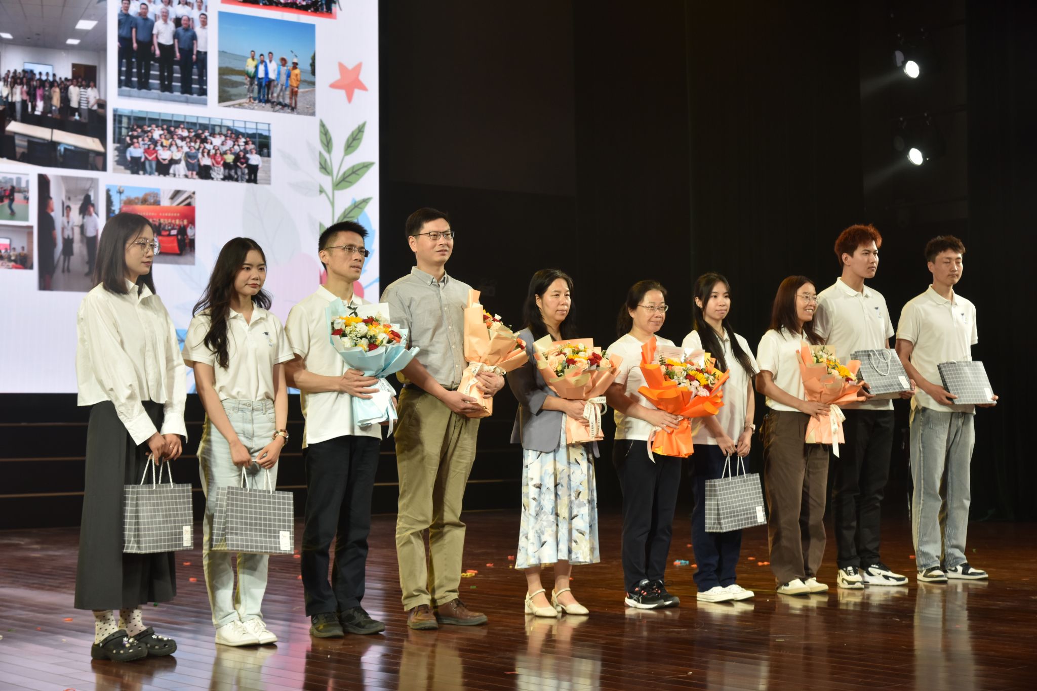 第四篇章“桃李芬芳·谢师恩”。活动现场播放了由毕业生精心制作的感言视频,同学们以真挚的语言回顾求学时光,向母校和师长表达深切感恩之情。随后,举行毕业纪念品互赠环节,教师代表向毕业生赠送学院文创纪念品,学生代表向教师代表献上感恩之花。
