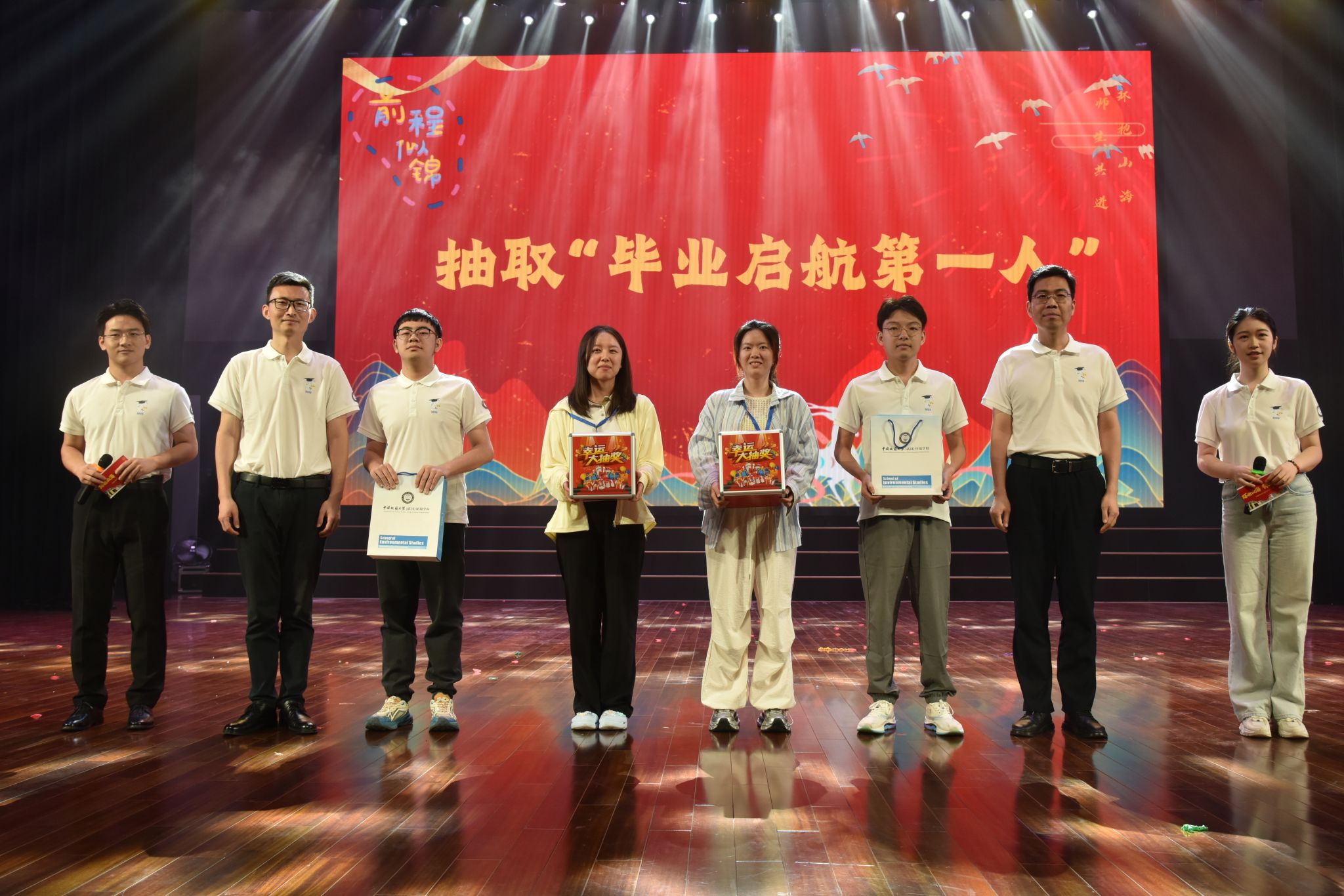 学院党委副书记王海锋和副院长孔少飞分别抽取本研“毕业启航第一人”,并为同学们赠送了学院纪念文创产品。